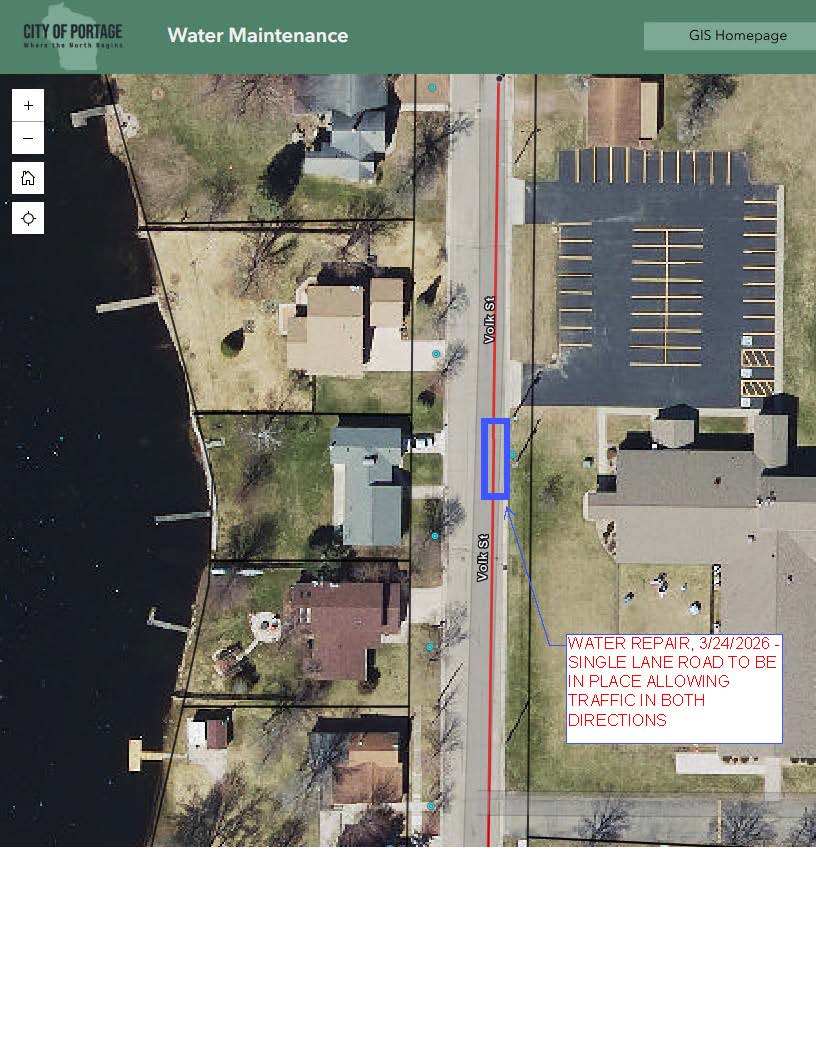 The City of Portage Utility Department will be performing a water repair on the 500 block of Volk Street today, March 24, 2026. During this repair Volk Street traffic will be limited to one lane, however, traffic will remain open at all times. There are no expected water shut downs as a result of this repair. We apologize for any inconveniences in advance.